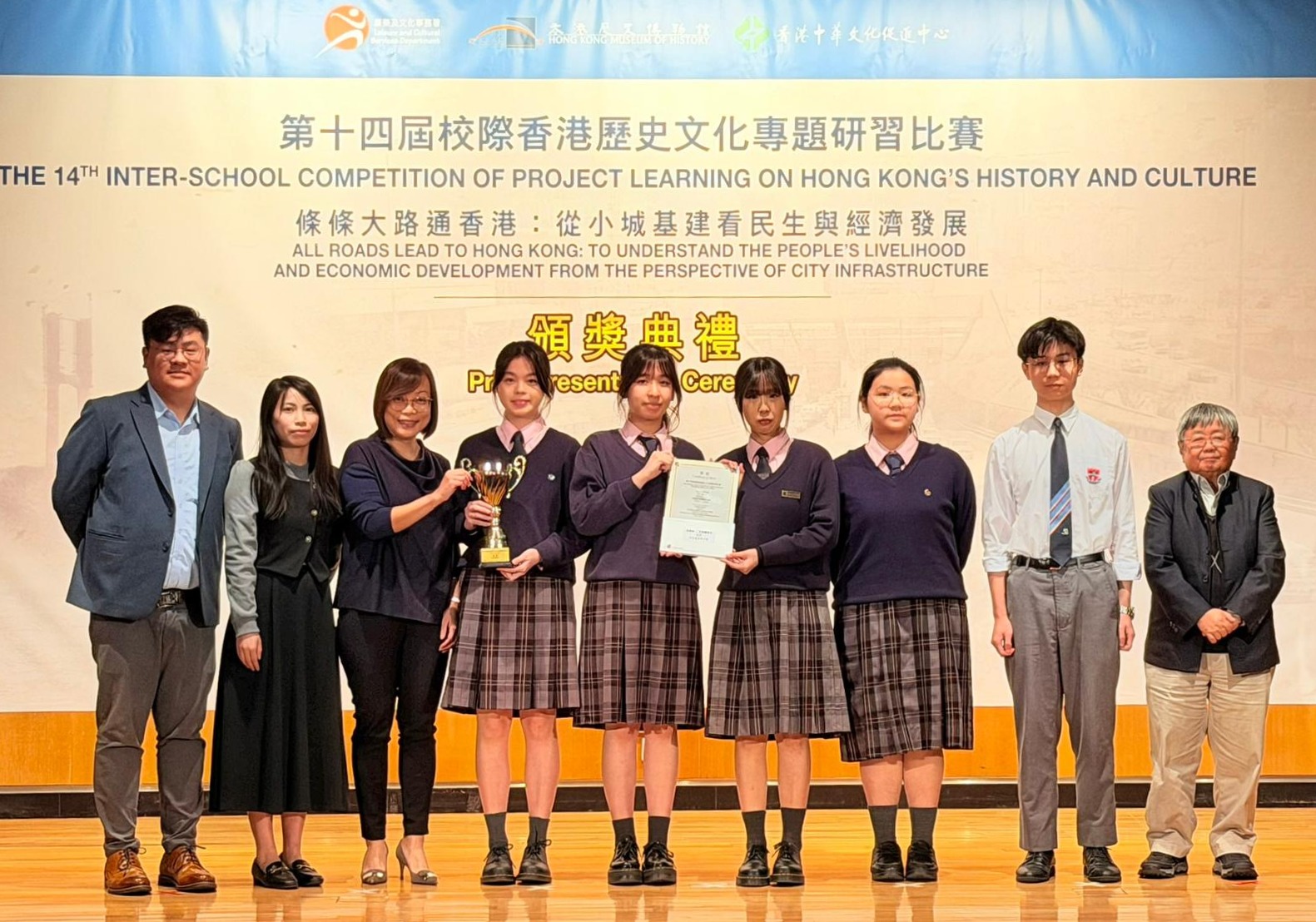 本校歷史科以「叮叮百載情——從電車看香港早期的民生與經濟發展」為題,參與香港歷史博物館、香港中華文化促進中心合辦的「第十四屆校際香港歷史文化專題研習比賽」,榮獲高級組冠軍(多媒體),並由比賽學術評審之一、香港著名歷史學者、香港大學中文學院名譽教授丁新豹教授頒發獎項。