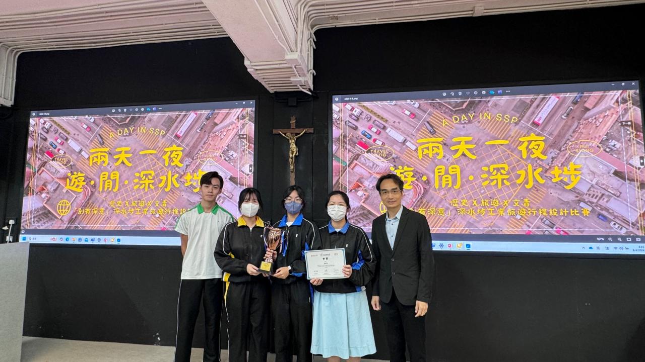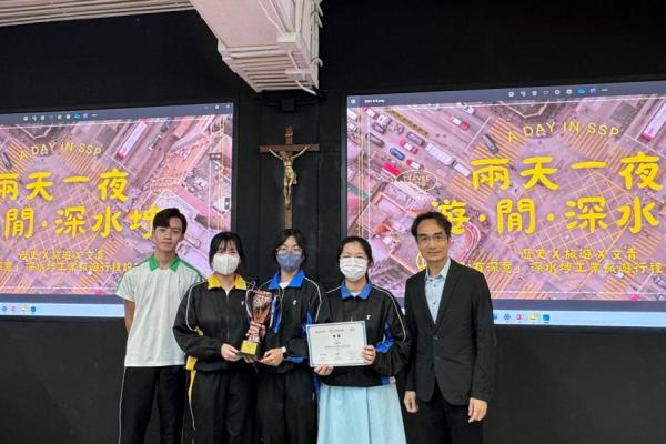 2024-04-25 我校歷史科及旅遊與款待科早前參加由香港特別行政區民政及青年事務局贊助,社企民間高峰會聯同夢創成真(Dream Impact) 合辦的「別有深意—深水埗工業旅遊行程設計比賽」。本校4位同學,4A劉思恩、鄭雍然、曾俊華及4B麥子鈴親身到深水埗進行實地考察及拍攝片段題材,規劃了一個兩日一夜的別有深意—深水埗工業旅遊行程。本校作品於3月30日順利進入決賽,並與其他中學隊伍即時在會場進行匯報,表現出色,最後榮獲「季軍」。