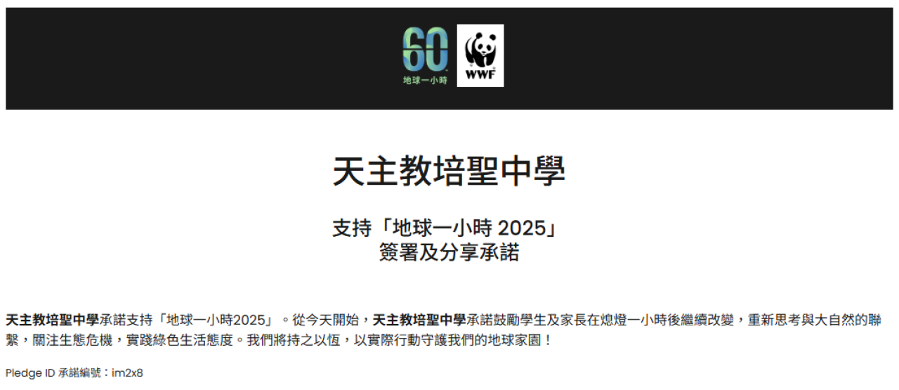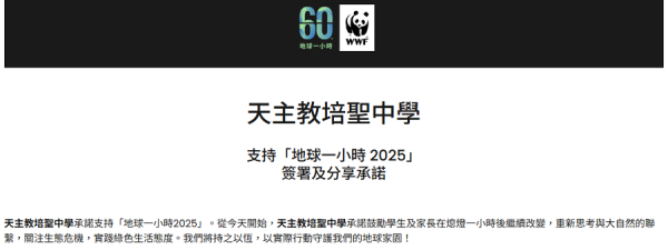 已承諾支持「地球一小時2025」活動,並在早會時段向全校師生分享活動詳情,鼓勵大家共同參與 2025年3月22日晚上8時30分開始熄燈一小時的環保活動。此外,主辦單位——世界自然基金會香港分會,當日下午會在港城海運大廈頂層觀景台舉行「地球一小時嘉年華」 。除了創意工作坊及攤位外,還會有現場表演及兒童音樂劇等,讓大眾了解保育的重要性。如有興趣,可瀏覽網站(地球一小時活動 – 地球一小時 2025 )了解更多詳情。