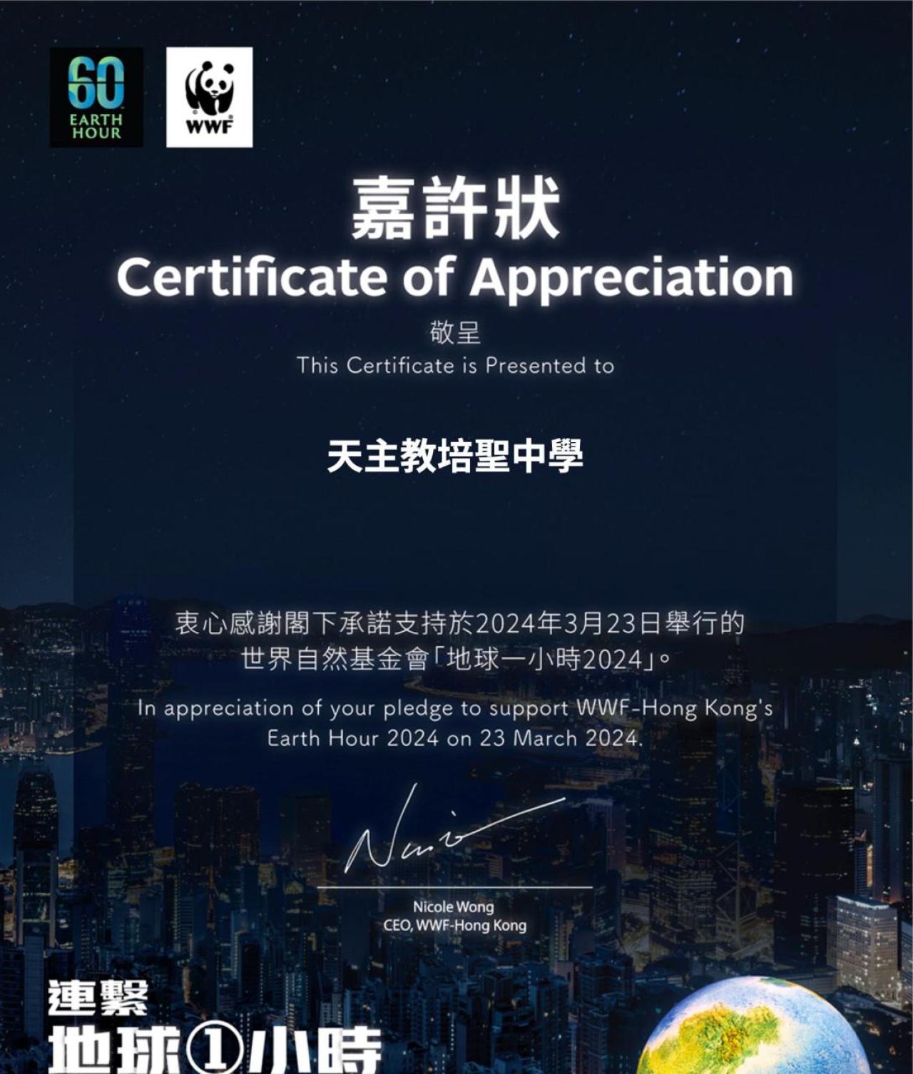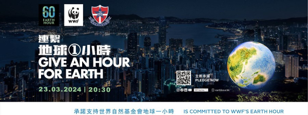 本校已承諾支持「地球一小時2024」活動,並在早會時段向全校師生分享活動詳情,鼓勵大家共同參與 2024年3月23日晚上8時30分開始熄燈一小時的環保活動。此外,主辦單位——世界自然基金會香港分會當日下午會在西九文化區藝術公園高草坪舉辦「地球一小時嘉年華」,透過一系列有趣的互動攤位活動,讓參加者學習保育資訊及實踐低碳生活。