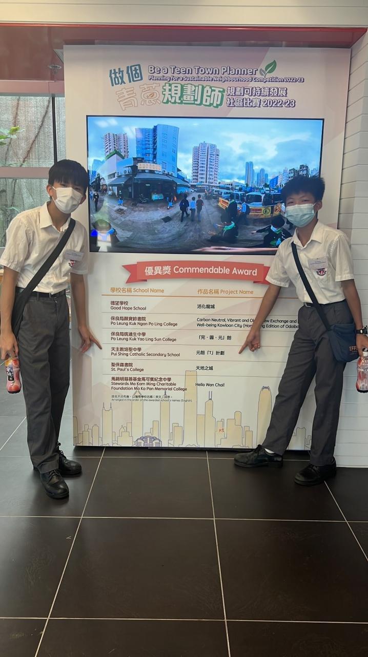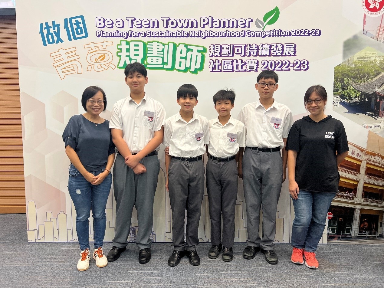 由教育局及規劃署合辦,「做個青蔥規劃師 — 規劃可持續發展社區」比賽,本校1A何政浩、何浩楝、吳家希、曾煒傑、溫浩南及1E文柏藍參賽作品「元朗T計劃」榮獲優異獎。是次比賽本校作品於60間參賽學校中脫穎而出,躋身9強,榮獲優異獎。
