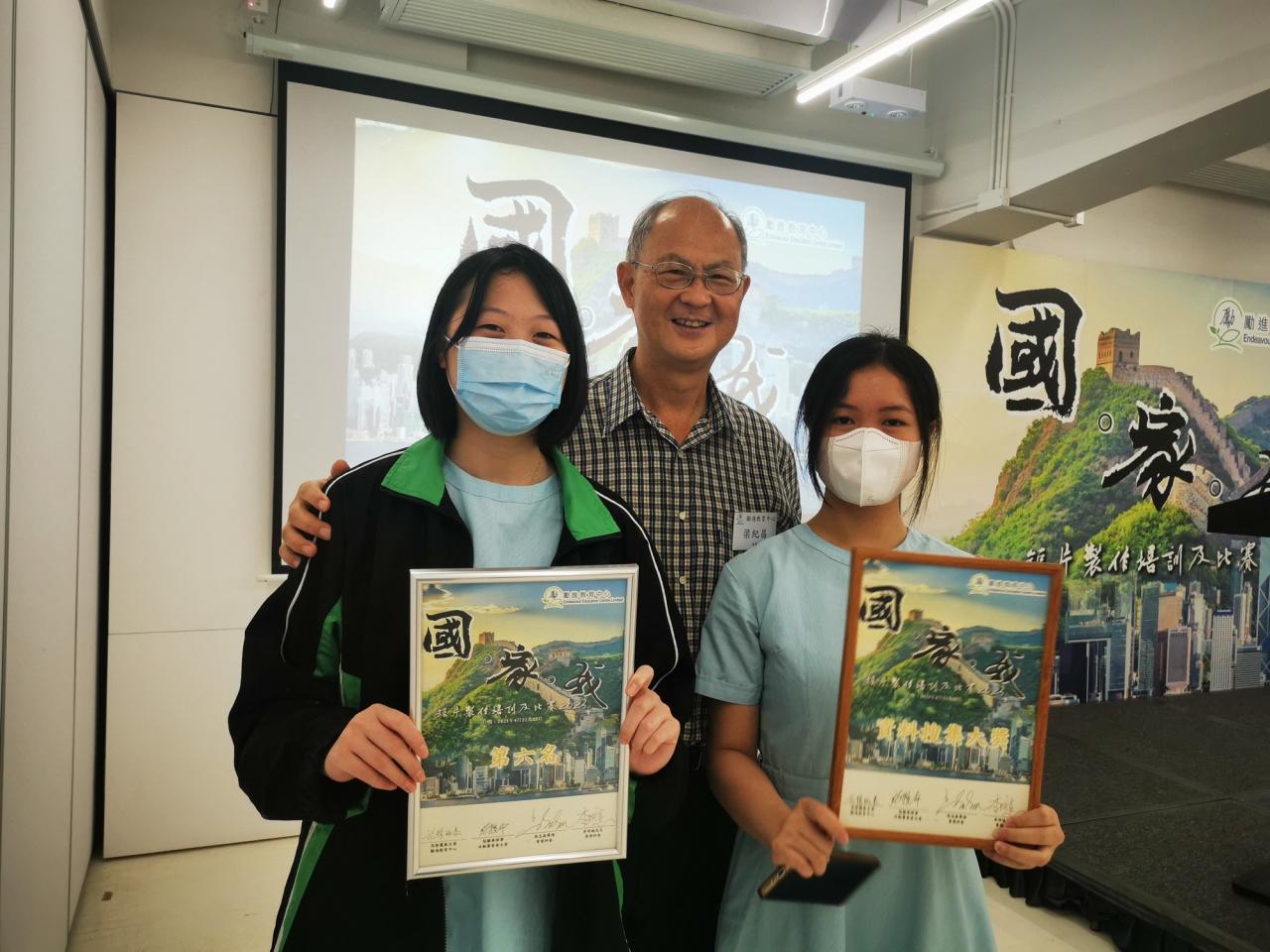 2023-06-26 本校在「國。家。我」短片比賽獲得獎項培聖公民科大使黃楚穎及廖美婧同學參加勵進教育中心舉辦的「國。家。我」短片比賽,在眾多參賽隊伍中,分別獲得第六名及資料搜集大獎。在頒獎典禮中,得獎同學與前律政司司長梁愛詩女士、校友梁紀昌校長及高志森導演合照留念。