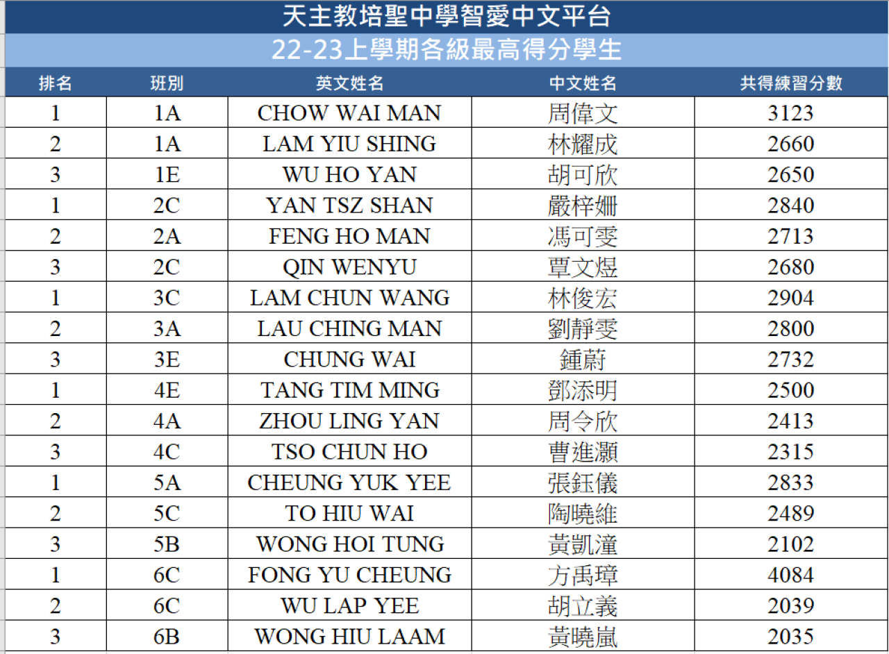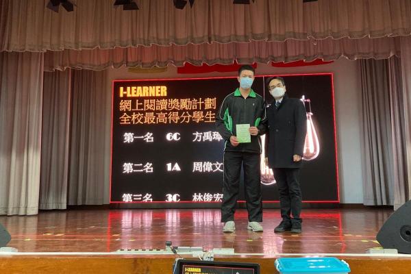 2023-02-06 上學期的I-Learner網上閱讀獎勵計劃結束,全校最佳表現班別和全校最高得分學生如下: 全校最佳表現班別 1A 2C 1B 林俊宏 (10) 全校最高得分學生6C方禹璋 (6) 1A周偉文 (3) 3C林俊宏 (10) 另,各級表現最佳的頭三名學生,均獲得「智好學計劃」的優秀學員獎, 得獎名單如下: