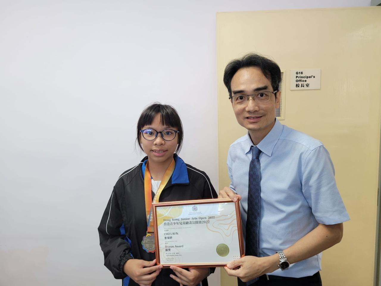 2023-05-22 青少年組:2A曹孋姸 (主題:寵物) 獲得(銅獎)獎牌及獎狀 是次比賽由香港兒童文化藝術協會舉辦。藝術領域發展組及視覺藝術科明確支持推行本校藝術發展,參與本港文藝機構,透過繪畫比賽提供一個展示藝術才華的平台,發揮藝術創意,並於創作的過程中,感受藝術帶來的樂趣,同時通過比賽加強自信。